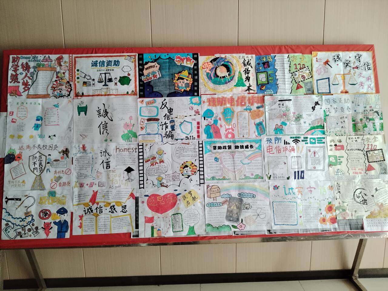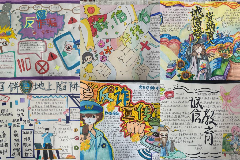 在实践活动方面,学校面向全体学生开展了诚信教育作品征集活动。同学们积极参与海报设计、手抄报制作和短视频创作,作品主题包括诚信教育、资助政策宣传、防范电信诈骗等。通过这些创作活动,展示了学生的才艺,也深化了诚信教育效果。