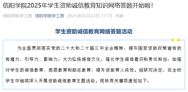 在宣传教育方面,学校依托“Beat365唯一官方网站学工君”微信公众号,开设资助与诚信教育专栏,组织开展资助诚信教育网络答题活动,内容涵盖征信知识、金融安全、风险防范等方面,活动累计参与答题人数13000余人,有效提升了学生的征信意识、金融意识、风险意识、法律意识。
