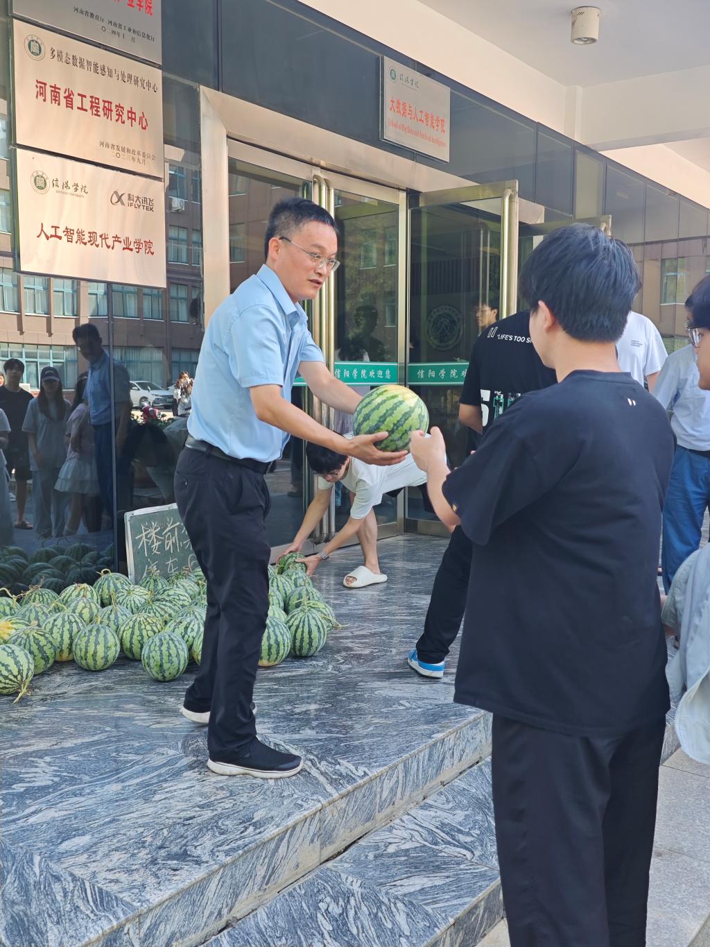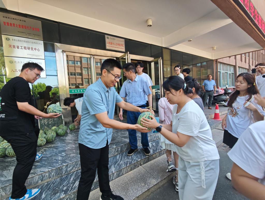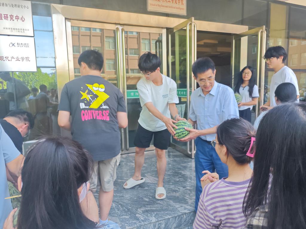 为切实关怀暑期留校备战考研的学子,鼓舞备考士气,营造安心、清凉的学习环境,7月2日上午,大数据与人工智能学院院长邬长安和学院党总支书记郭二军带领学院班子成员和相关辅导员老师前往考研自习室,为留校考研学生送上清甜解暑的西瓜以及真挚的关怀与暖心的支持。