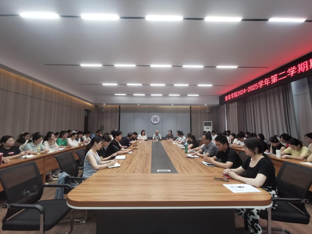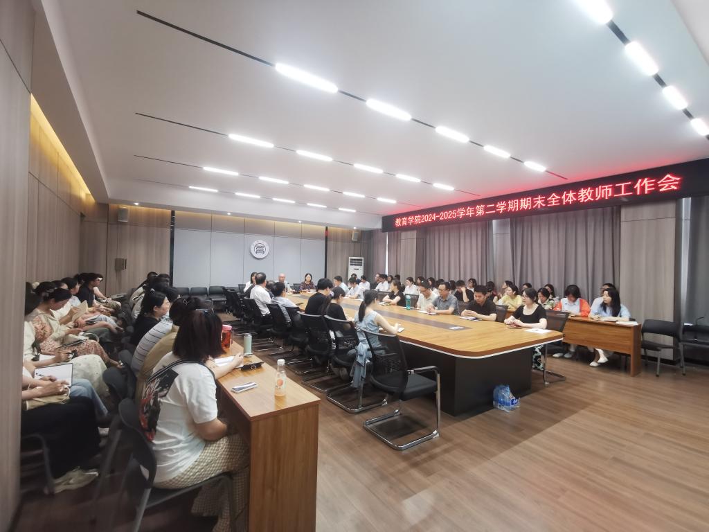 为全面总结本学期教育教学工作成果,统筹部署假期及新学期重点任务,7月1日下午,教育学院在社科楼109会议室召开了2024—2025学年第二学期期末全体教师工作会议,名誉院长、党总支书记刘颖方、副院长段海丹及班子成员、专家教授和全体青年教师参加了此次会议,名誉院长主持了会议。