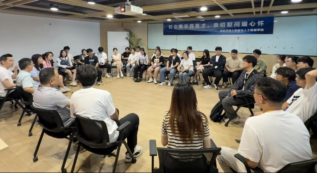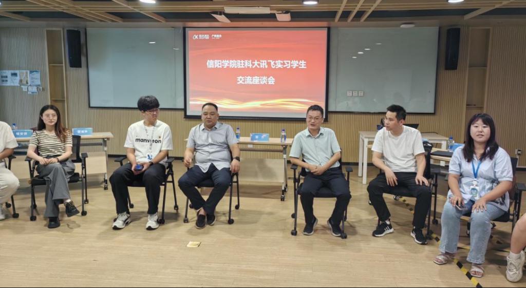 毛凤翔一行与全体实习学生进行了交流座谈。座谈会上,毛凤翔代表学院进行慰问讲话。他首先肯定了学生的成长足迹,并指出,看到同学们在技术一线展现的专业素养和拼搏状态,印证了校企联合培养的显著成效。希望大家珍惜讯飞提供的顶尖产业平台,将“纸上理论”转化为“手中利器”。他对实习学生提出三点要求,一要深度融入项目实践,主动投身企业真实研发全流程,精研需求分析、代码调试与团队协作能力;二要敢于迎战技术难关,以工程师思维破解复杂问题,在大模型开发等前沿领域积累实战经验;三要筑牢职业发展根基,学习讯飞创新基因与工匠精神,为成长为人工智能领域的中坚力量奠定坚实基础。最后,毛凤翔叮嘱同学们要注意防暑降温与实习安全,强调学院始终是大家的坚实后盾,遇到任何困难要第一时间和辅导员老师反馈。