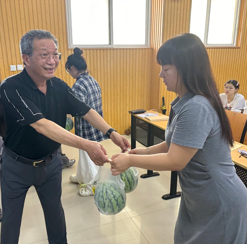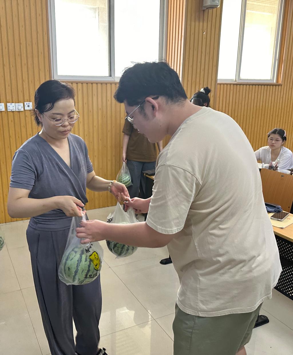 活动最后,领导老师们手捧着饱满多汁、清凉解暑的西瓜,逐一送到考研学子手中。这份裹挟着清甜的“清凉礼包”,承载着学院对学子们的深切关怀与殷切期许,也传递着浓厚的师生情谊。学子们纷纷表示,将把这份关怀转化为冲刺的动力,以更加昂扬的姿态投入备考,力争在考研战场上披荆斩棘,取得优异成绩,为学院增光添彩。