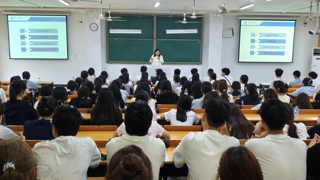 9月9日下午,理工学院化学教研室主任黄艳伟在人文楼108教室开展题为“分子跃动,未来启程”的新生入学专业教育。黄艳伟首先对2025级化学专业新生表示热烈的欢迎。然后,她从专业简介、师资队伍、教学条件、人才培养质量和社会声誉等四个方面进行了生动形象地阐述,并与同学亲切互动。接着,展示了在校生的学习成果,希望通过这些闪光的足迹,激励每一位新生锚定目标,用四年时光书写属于自己的成长篇章。最后,播放了优秀校友对学弟、学妹的寄语视频,新生们都纷纷表示以优秀校友为榜样,好好珍惜大学时光。