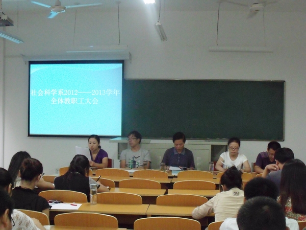 9月2日上午,社会科学系2012—2013学年全体教师大会在教四楼207教室召开,系主任陈录生、副主任张甲楠及全系教师参加了会议,会议由行政秘书胡秀云主持。