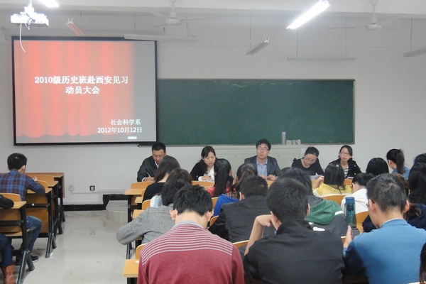 10月14日下午,社会科学系历史专业见习动员会在教四楼318教室召开。该系副主任张甲楠、教学秘书张红梅、行政秘书胡秀云、学工秘书胡志国、辅导员徐晓琰和2010级全体学生参加了会议。会议由胡秀云主持。