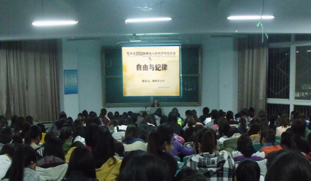 10月18日晚,艺术系《自由与纪律》2012级新生入学教育主题报告会在教二楼107教室举行,报告会由郑娇娇老师主讲。该系学工秘书高昌慧、各辅导员老师和全体2012级新生聆听了报告。