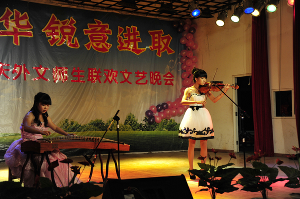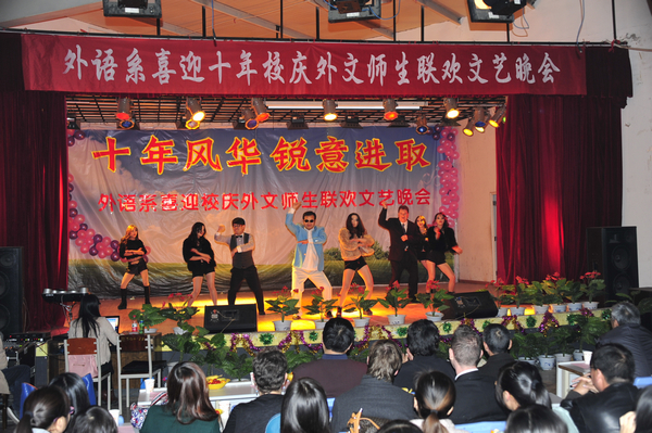晚会在激情四射的舞蹈《Gentleman》中拉开帷幕,律动的节奏、动感的身姿调动起现场的热烈气氛;《Listen》、《Start of Something New》、《Back to December》等等一首首经典的英文歌曲,让师生们享受了一次音乐盛宴;《Crazy girl》、《Poker Face》等活力动感的舞蹈充分展示外语系女生的魅力,点燃了全场如火激情;悠扬的乐器合奏《美人花》展示了小提琴和琵琶交汇的独特魅力;欢快的民族舞、引人入胜的英语影视配音将广大师生带入到唯美的意境;日籍外教泽村贵志及赵蕊老师演唱的歌曲更是为晚会增添了动人的色彩;陈俊明老师的英语脱口秀《Skillful Learning of English Pronunciation》以出色的口技与模仿才华展示了各国英语口语魅力,赢得了观众们一阵阵热烈的掌声和欢呼声;为华锐学院院庆献礼的原创歌曲《活力华锐》展示了年轻大学生的青春风采及对母校的深情祝福;外语系乐队演奏的三首经典曲目将晚会推向了高潮,强劲的架子鼓声、独具特色的电吉他声,以及主唱富有感染力的歌声,使得全场沸腾;最后,晚会在外语系所有外籍教师共同倾情演绎的英语诗朗诵《光辉十年》中画上了圆满的句号。