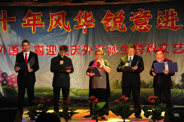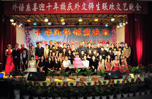 11月12日晚,外语系以“十年风华,锐意进取”为主题的喜迎院庆十周年外文师生联欢文艺晚会在大学生活动中心举行。督导督察室主任、教学部副部长于祥杰教授,中文系主任傅瑛教授,外语系主任罗德喜教授,社会科学系主任陈录生教授,经济管理系主任孟广章教授,督导督察室副主任张富良教授,学工部副部长张富庄,人事部副部长李赟等与700余名师生共同观看了晚会。