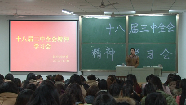 11月20日晚,社会科学系在教四楼112教室召开十八届三中全会精神学习会。该系党总支副书记胡志国、相关教师、学生党员、党员发展对象、入党积极分子等200名师生参加了此次学习会。