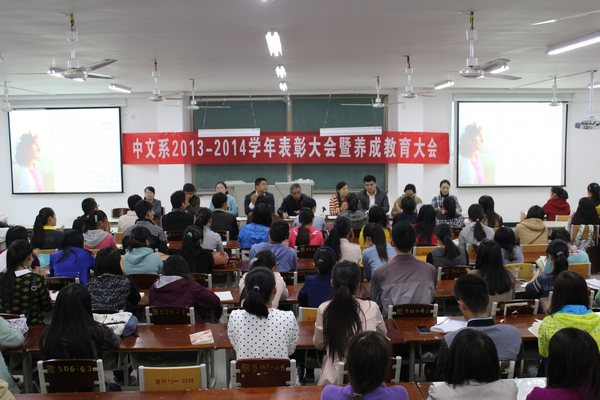 10月21日下午,中文系2013—2014学年表彰大会暨文明、劳动、安全教育大会在人文楼308教室召开。系主任傅瑛教授、行政秘书娄琪、教学秘书陈浩、学工干事朱新荣以及全体辅导员老师和200余名学生干部参加了会议,会议由朱新荣主持。