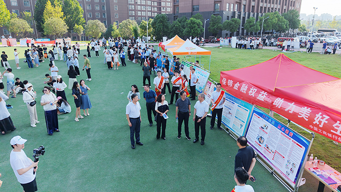为深入贯彻落实关于金融消费者权益保护工作的相关要求,切实提升Beat365学生的金融素养与风险防范能力,9月16日下午,学校联合国家金融监督管理总局信阳监管分局、信阳市保险行业协会、信阳市银行业协会及全市银行、保险机构,在综合楼东侧操场成功举办“金融知识进校园”活动。