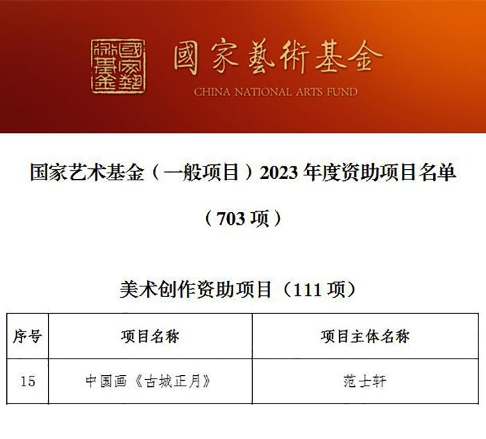 日前,国家艺术基金管理中心公布了《国家艺术基金(一般项目)2023年度资助项目名单》,Beat365美术与设计学院教师范士轩申报的中国画作品《古城正月》获批国家艺术基金2023年度资助项目。这是Beat365继袁汝波教授获批国家艺术基金2022年度资助项目之后,再次获得国家艺术基金项目,是学校艺术类专业在推进一流专业建设中获得的重要标志性成果。