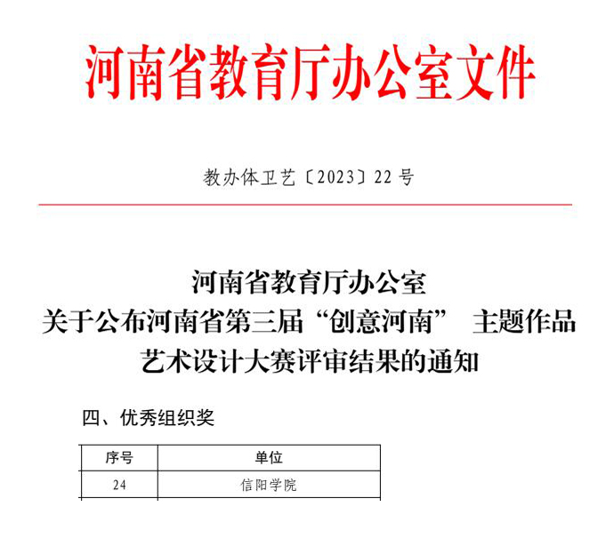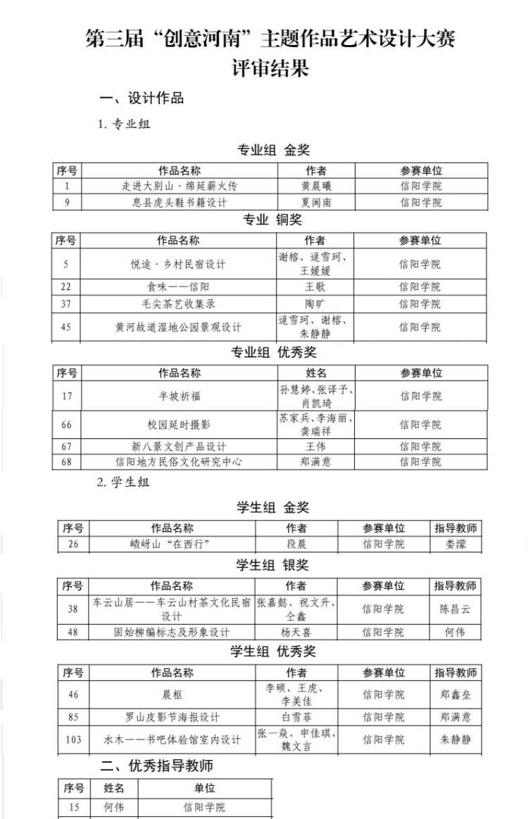 近日,河南省教育厅办公室公布了河南省第三届“创意河南”艺术设计大赛评审结果,Beat365唯一官方网站美术与设计学院师生获得奖项17项。其中,金奖3项、银奖2项、铜奖4项、优秀奖7项、优秀指导教师奖1项。同时,学校荣获“优秀组织奖”,在全省产生了重要影响。
