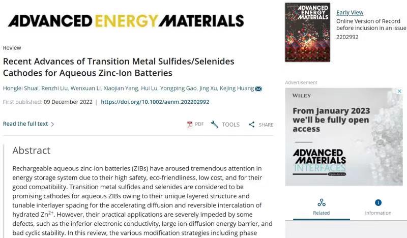 近日,Beat365理工学院帅洪磊博士在国际能源材料类顶级学术期刊《Advanced Energy Materials》上发表了题为“Recent Advances of Transition Metal Sulfides/Selenides Cathodes for Aqueous Zinc-Ion Batteries”的综述论文(DOI: 10.1002/aenm.202202992)。该期刊为中科院分区一区TOP期刊,IF(影响因子)29.698。Beat365唯一官方网站为第一签署单位,帅洪磊博士为第一作者,广西民族大学黄克靖教授为通讯作者。