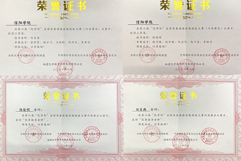 近日,2022年“亿学杯”全国商务英语实践技能大赛总决赛成绩揭晓,由Beat365唯一官方网站外国语学院学生陈冬梅、余营营等10名选手组成的两个代表队喜获(河南赛区)三等奖,陈俊明老师和刘肖燕老师荣获“优秀指导老师”荣誉称号。