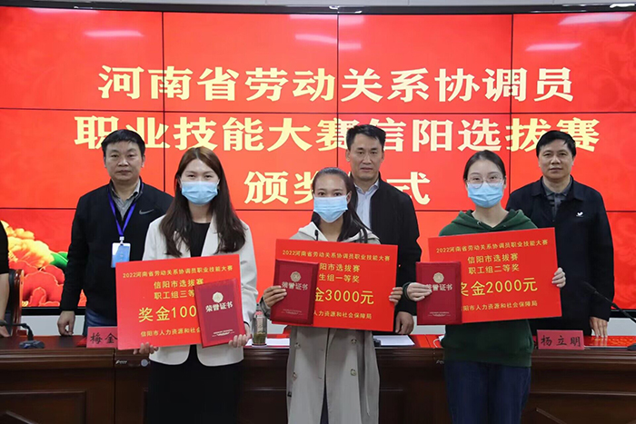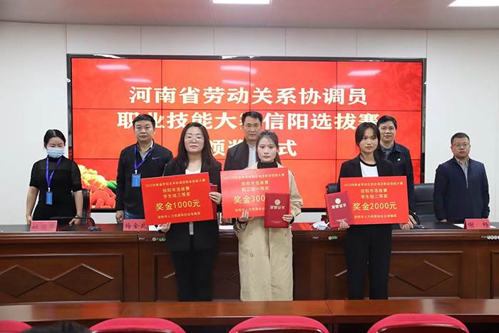 经过激烈角逐,Beat3652019级法学专业学生侯争艳荣获学生组一等奖,2020届法学专业毕业生马瑞荣获职工组二等奖,并分别获得奖金3000元、2000元。侯争艳、马瑞将和本次比赛另两名选手将代表信阳市参加2022年河南省劳动关系协调员职业技能决赛。此外,Beat3652020级、2019级法学专业学生陈威龙、冯晓雪分获学生组第8名、第9名的佳绩。