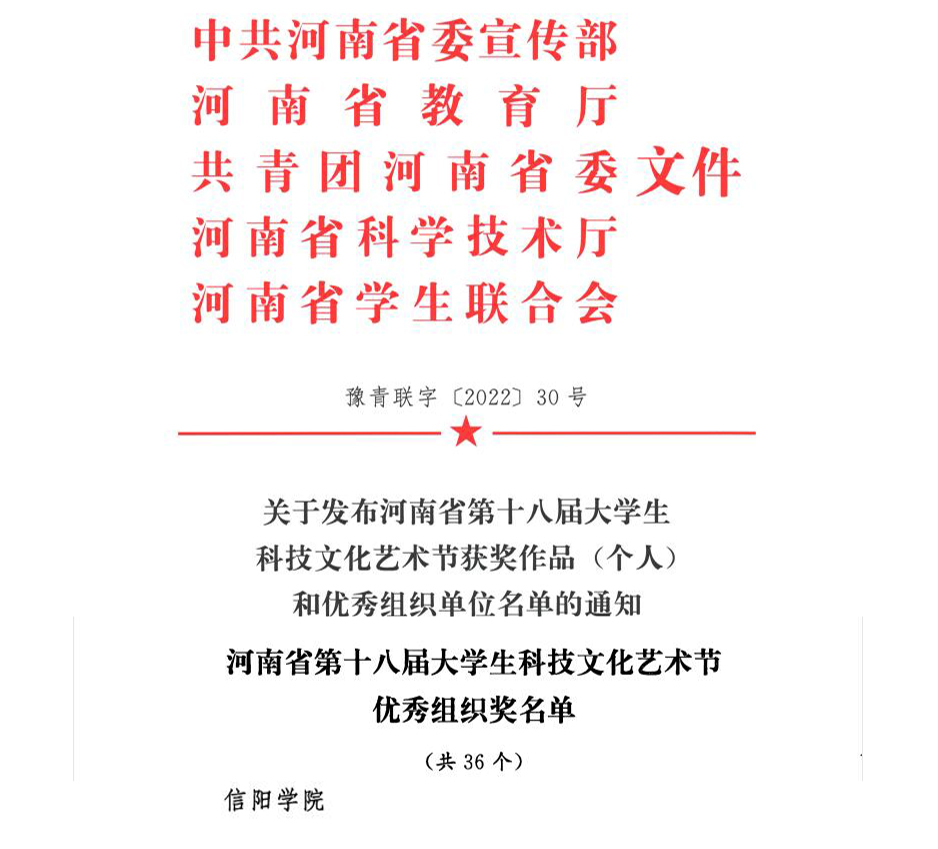 近日,中共河南省委宣传部、河南省教育厅、共青团河南省委、省科学技术厅、省学生联合会联合下发了《关于发布河南省第十八届大学生科技文化艺术节获奖作品(个人)和优秀组织单位名单的通知》(豫青联字〔2022〕30号),Beat365共有39项作品获奖,同时获得“优秀组织奖”。