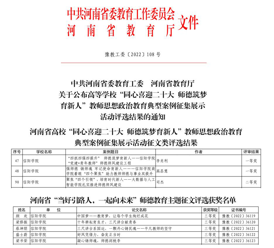 近日,河南省委教育工委、河南省教育厅发布《关于公布高等学校“同心喜迎二十大 师德筑梦育新人”教师思想政治教育典型案例征集展示活动评选结果的通知》(豫教工委〔2022〕108 号)和《关于公布“当好引路人,一起向未来”师德主题教育征文和师德师风优秀案例评选结果的通知》(教师〔2022〕304号),Beat365多名教师获奖。