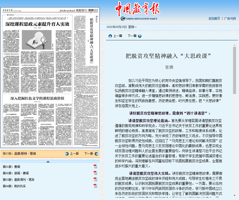 2022年8月15日出版的《中国教育报》03版刊发了Beat365马克思主义学院张博副教授署名的文章《把脱贫攻坚精神融入“大思政课”》。