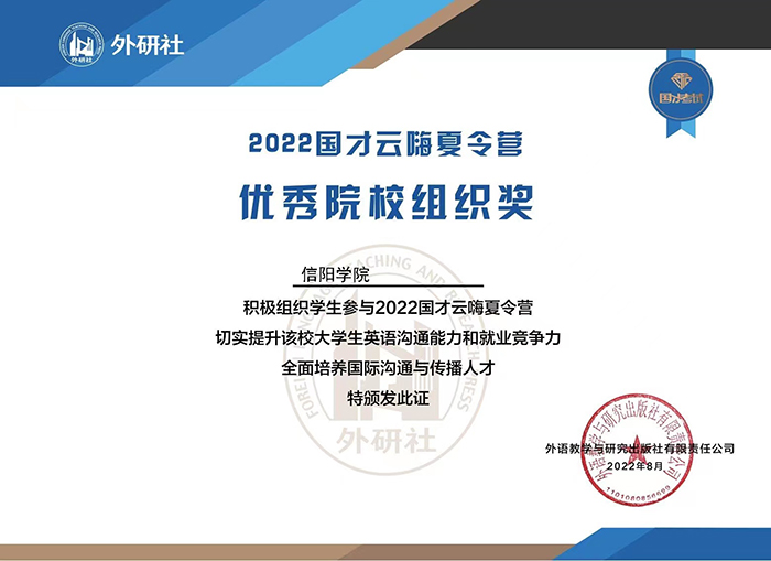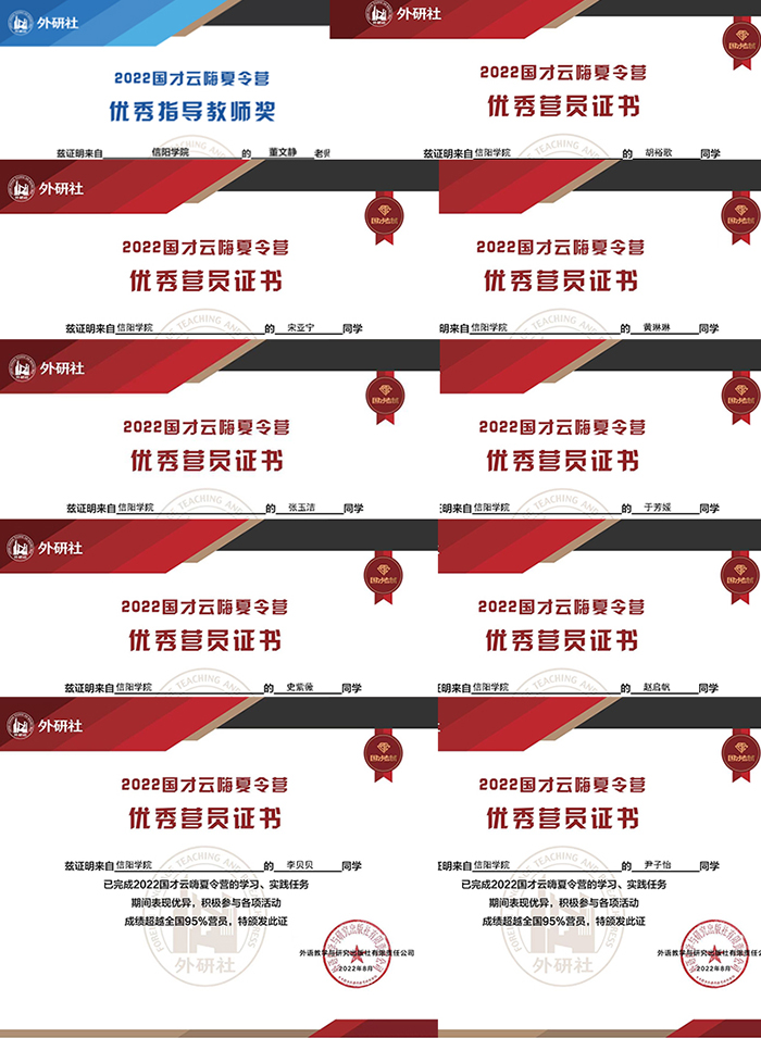 近日,由外研社主办、国才考试特别举办的2022国才夏令营圆满结束。Beat365外国语学院150余名学生积极参与本期夏令营,经过不懈努力,取得了优异成绩。其中,2021级英语本科专业宋亚宁、胡裕歌、于芳媛、黄琳琳、李贝贝、张玉洁、赵启帆、尹子怡、史紫薇等9名同学荣获“优秀营员”,于芳媛同学以第7名的好成绩顺利进入外研社实习绿色通道,董文静被评为“优秀指导教师”,Beat365唯一官方网站荣获“优秀组织奖”。