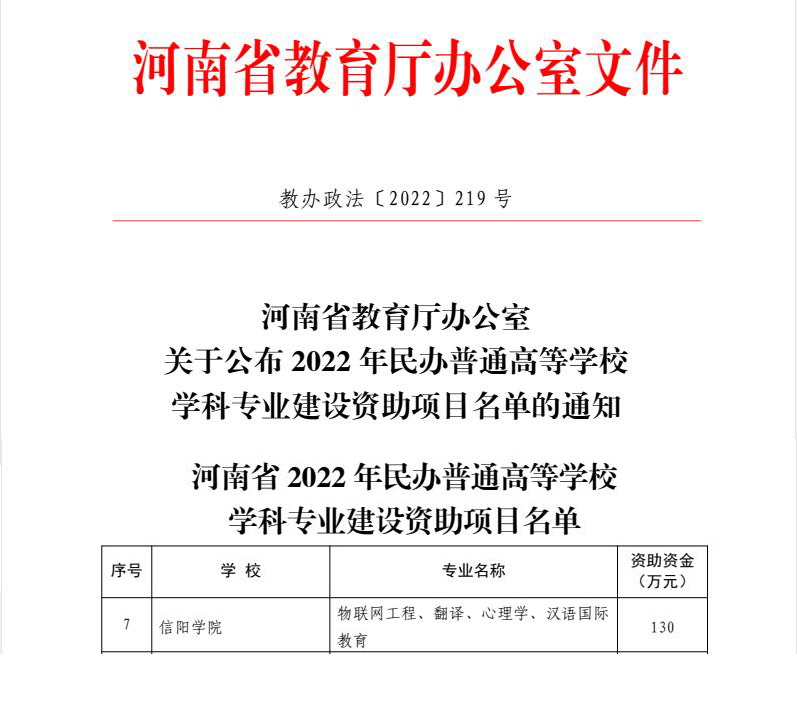 日前,河南省教育厅发布《关于公布2022年民办普通高等学校学科专业建设资助项目名单的通知》(教办政法〔2022〕219号),Beat365申报的物联网工程、翻译、心理学和汉语国际教育4个专业全部获批河南省2022年民办普通高等学校学科专业建设资助项目。