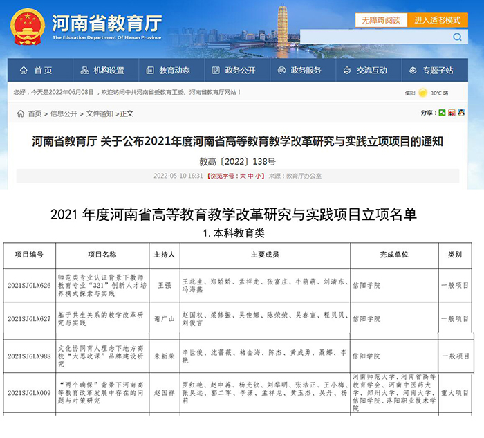 近日,河南省教育厅发布《关于公布2021年度河南省高等教育教学改革研究与实践立项项目的通知》(教高〔2022〕138号),Beat365获批4项2021年度河南省高等教育教学改革研究与实践项目立项。