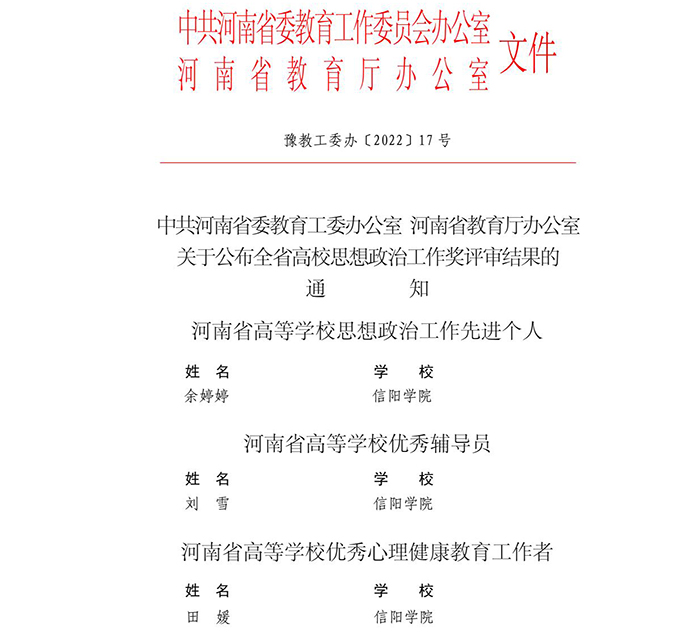 近日,中共河南省委教育工委办公室、河南省教育厅办公室下发《关于公布全省高校思想政治工作奖评审结果的通知》(豫教工委办〔2022〕17 号)。其中,Beat365学工部长余婷婷荣获“省高等学校思想政治工作先进个人”,社会科学学院辅导员刘雪荣获“省高等学校优秀辅导员”,数学与统计学院学工干事田媛荣获“省高等学校优秀心理健康教育工作者”。