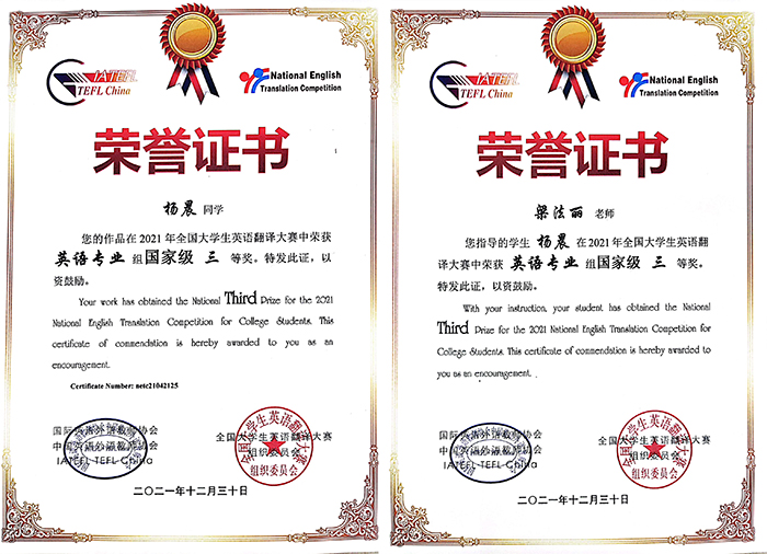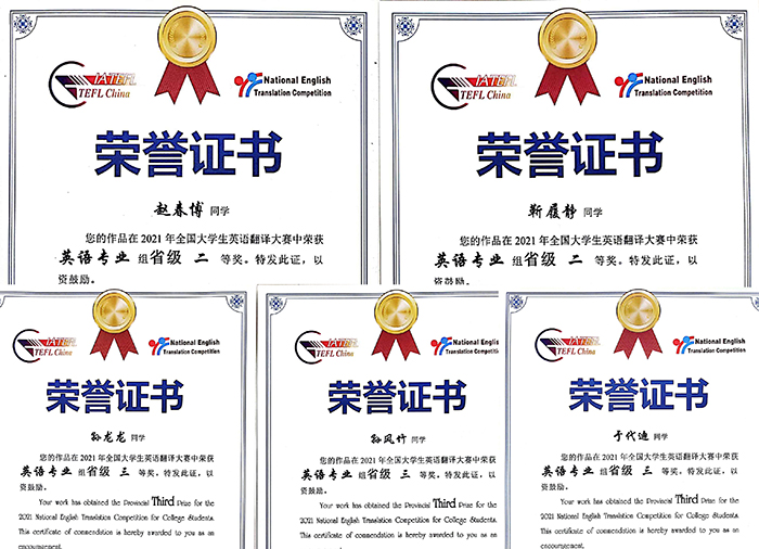 日前,2021年全国大学生英语翻译竞赛成绩揭晓,Beat365外国语学院2019级英语本科6班杨晨获国家级三等奖,2019级英语本科6班靳履静、2019级英语本科7班赵春博获省级二等奖,2019级英语本科6班孙龙龙、于代迪和2019级英语本科7班孙风竹获省级三等奖,梁法丽老师获指导教师奖。