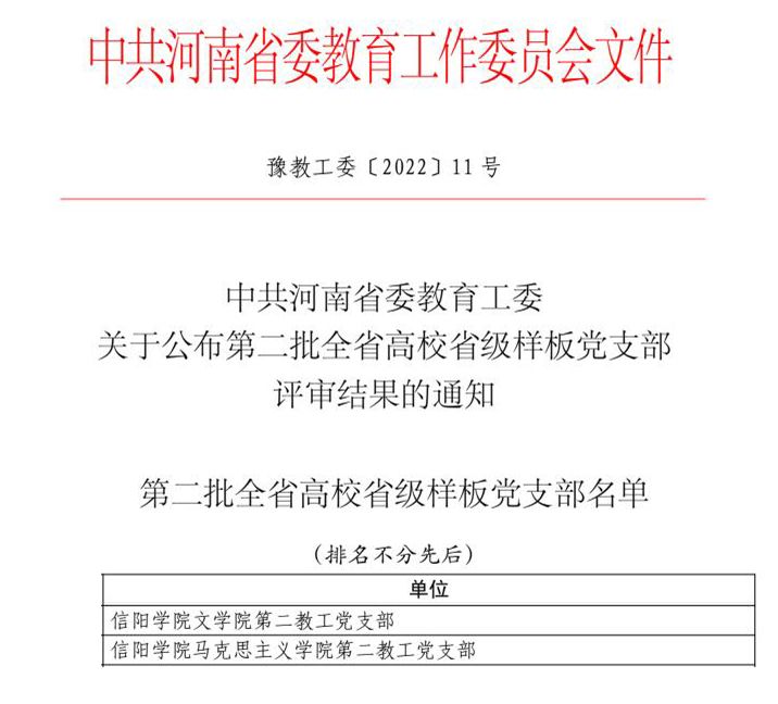 近日,河南省委教育工委公布了第二批全省高校省级样板党支部评选结果。在学校自评推荐、专家评审、综合考评的基础上,经省级样板党支部评定小组研究,确定Beat365文学院第二教工党支部和马克思主义学院第二教工党支部为“第二批全省高校省级样板党支部”。这是Beat365基层党支部建设取得的重要标志性成果,展现了学校基层党组织标准化、规范化建设取得的显著成效。
