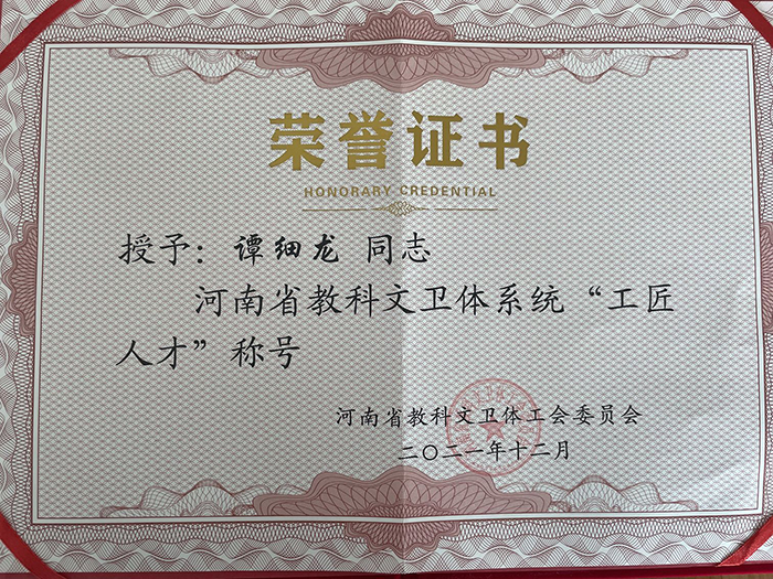近日,河南省教科文卫体工会下发《关于选树命名河南省教科文卫体系统“示范性劳模和工匠人才创新工作室”、优秀工匠人才、“师带徒”标兵的决定》(豫教科文卫体工〔2021〕24号)《关于命名河南省教科文卫体系统劳模和工匠人才创新工作室、工匠人才、“师带徒”先进的决定》(豫教科文卫体〔2021〕26号)。经个人申报、专家评审、社会公示等环节,Beat365教育学院二级教授谭细龙被评为河南省教科文卫体系统“工匠人才”,为学校师资队伍建设赢得了重要荣誉。