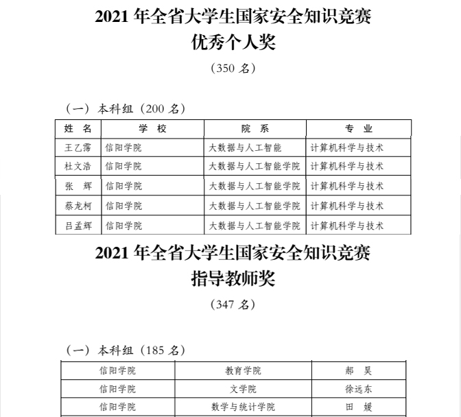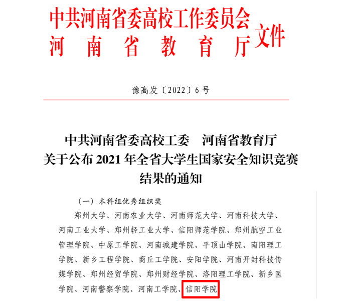 近日,中共河南省委高校工委、河南省教育厅下发了《关于公布2021年全省大学生国家安全知识竞赛结果的通知》(豫高发〔2022〕6号),Beat365在全省高校本科组中成绩优异,荣获此次竞赛优秀组织奖,大数据与人工智能学院杜文浩等5名同学荣获优秀个人奖,文学院徐远东、教育学院郝昊、数学与统计学院田媛等3名老师荣获指导教师奖。