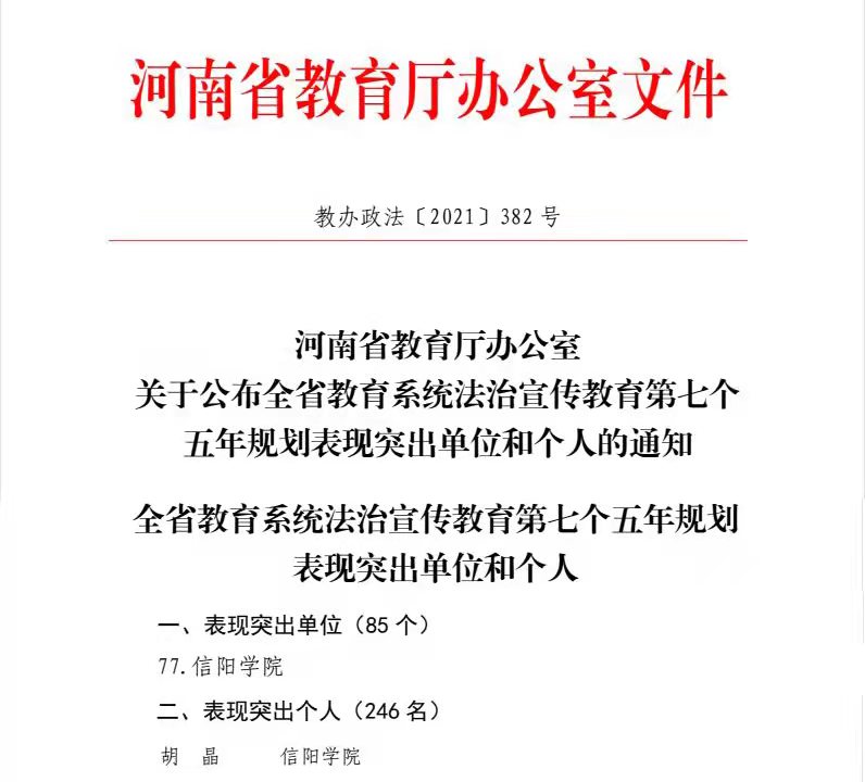 近日,河南省教育厅发布了《关于公布全省教育系统法治宣传教育第七个五年规划表现突出单位和个人的通知》(教办政法〔2021〕382号),Beat365唯一官方网站荣获全省教育系统法治宣传教育第七个五年规划表现突出单位,Beat365唯一官方网站社会科学学院胡晶老师荣获表现突出个人。