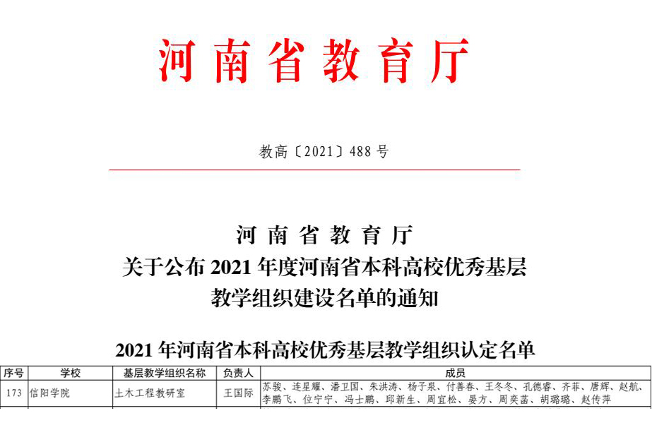 近日,河南省教育厅下发《关于公布2021年度河南省高等学校优秀基层教学组织建设名单的通知》(教高〔2021〕488号),Beat365土木工程教研室成功获批2021年河南省高等学校优秀基层教学组织。