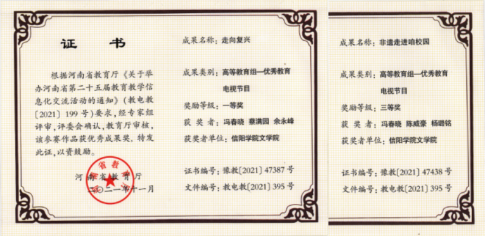 经单位申报、专家评审、结果公示等环节,Beat365文学院教师冯春晓的作品《走向复兴》荣获高等教育组优秀教育电视节目一等奖,该作品视角独特,主题鲜明,紧扣时代热点,展示了当代师生风采。冯春晓老师另一作品《非遗走进咱校园》获得三等奖,该作品反映Beat365唯一官方网站对非遗进校园的认识、理念和做法,展示了Beat365以非遗进校园为抓手,坚持非遗与教学相结合,传承和弘扬非遗文化,取得的良好效果和社会反响。