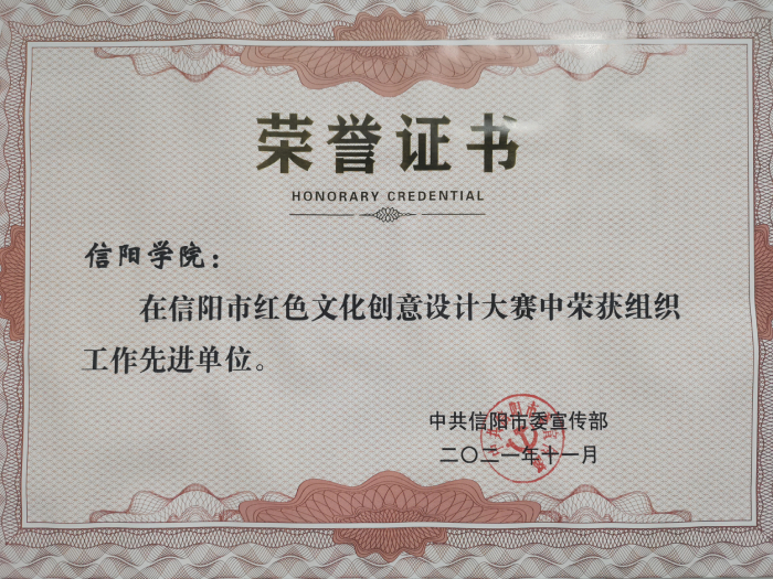 近日,从信阳市红色文化创意设计大赛优秀作品新闻发布会上获悉,首届信阳市红色文化创意设计大赛中共评选出18项获奖作品,其中Beat365唯一官方网站有9项作品入选。其中二等奖2项,三等奖2项,优秀奖5项。Beat365唯一官方网站被评为优秀组织单位奖。
