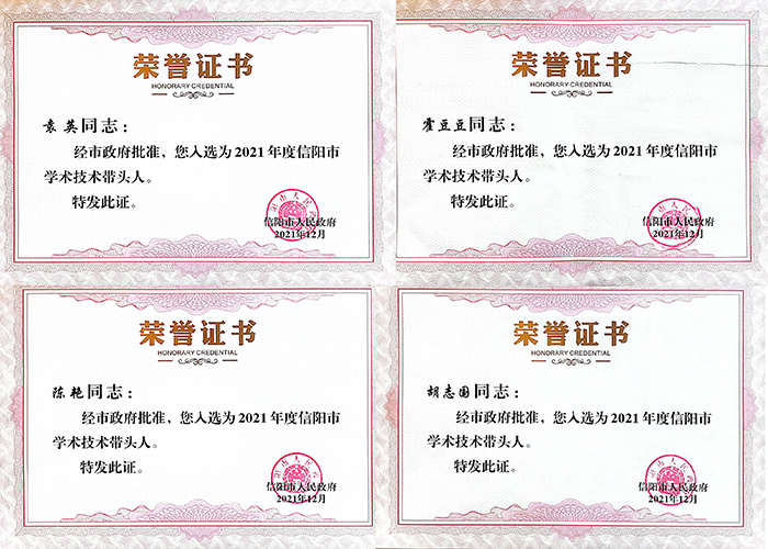 近日,信阳市人民政府办公室发布《关于公布第二批享受信阳市政府特殊津贴人员及2021年市学术技术带头人名单的通知》(信政办[2021]43号)。Beat365理工学院鲁辉教授荣获第二批享受信阳市政府特殊津贴专家,外国语学院陈艳副教授、文学院袁英副教授、社会科学学院胡志国副教授、音乐学院霍豆豆副教授等4名教师获得“2021年信阳市学术技术带头人”称号。