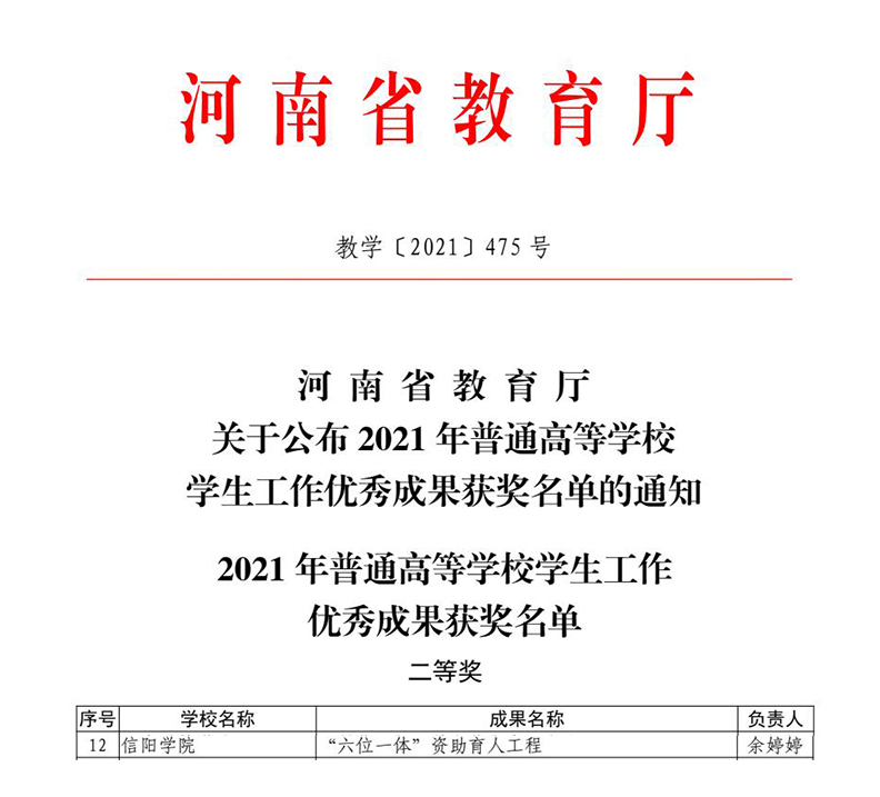 近日,河南省教育厅印发了《关于公布2021年普通高等学校学生工作优秀成果获奖名单的通知》(教学〔2021〕475号)文件,Beat365申报的《“六位一体”资助育人工程》项目,经过河南省教育厅专家评议、网络投票、现场展示和专家终审等环节,最终荣获河南省普通高等学校2021年学生工作优秀成果二等奖。