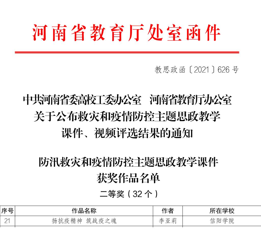 近日,河南省教育厅公布了“防汛救灾和疫情防控”主题思政教学课件、教学视频评审结果。Beat365马克思主义学院形势与政策教研室教师李亚莉的教学课件《扬抗疫精神,筑战疫之魂》在全省众多推荐作品中脱颖而出,荣获二等奖。