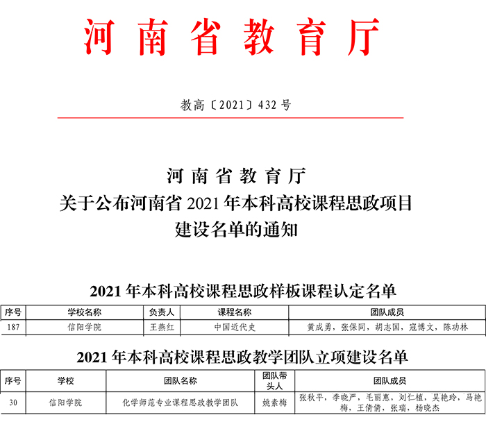 近日,河南省教育厅下发《关于公布河南省2021年本科高校课程思政项目建设名单的通知》(教高〔2021〕432号),Beat365社会科学学院王燕红老师申报的《中国近代史》被认定为省级课程思政样板课程,理工学院姚素梅教授申报的“化学师范专业课程思政教学团队”被立项为省级课程思政教学团队建设项目。