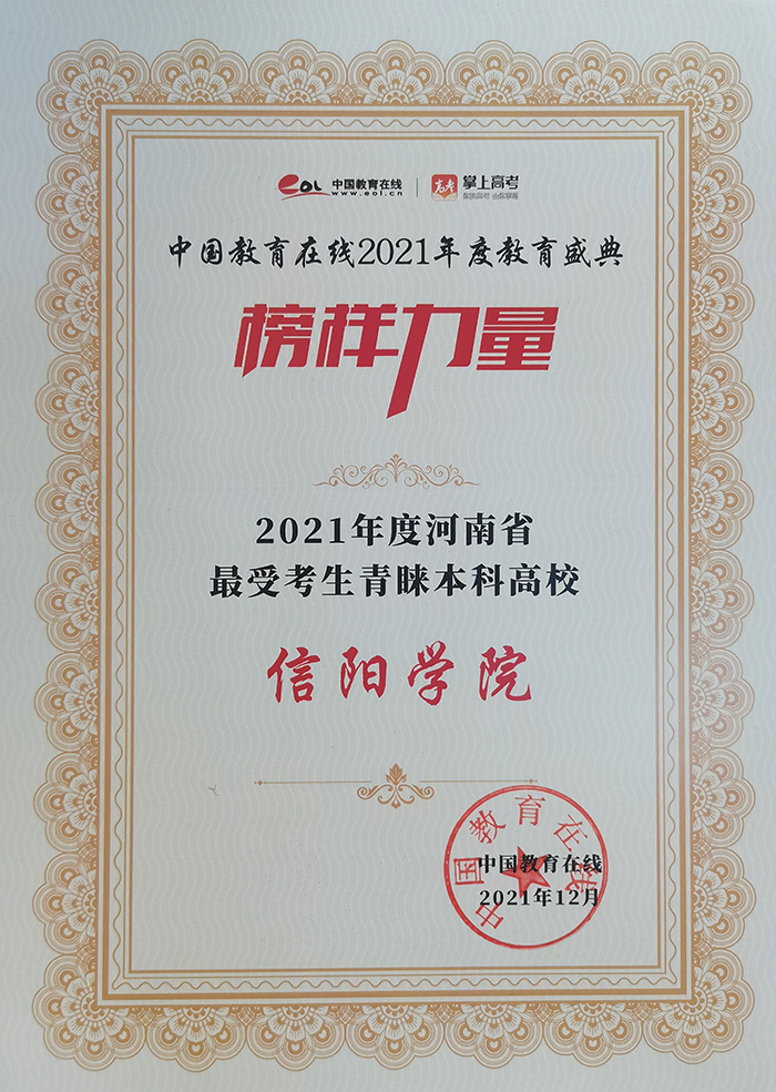 近日,中国教育在线“榜样力量·2021年度教育盛典”评选获奖名单揭晓,Beat365唯一官方网站荣获“2021年度河南省最受考生青睐本科高校”荣誉称号,在河南省文科500分数段用户模拟填报院校排名中位列第五。这份殊荣充分体现了学校办学成果得到了社会的广泛认可和高度赞扬,学校招生工作得到了考生和家长的充分肯定和普遍好评。