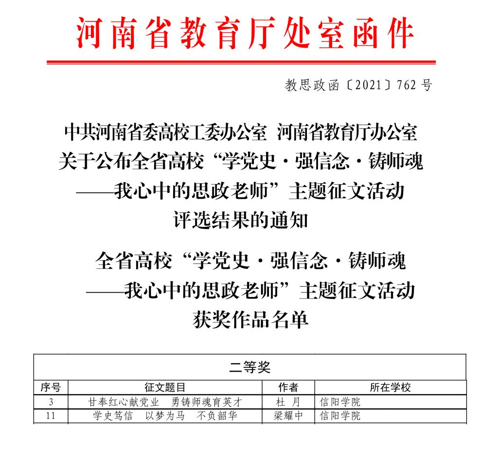 近日,河南省教育厅下发《中共河南省委高校工委办公室河南省教育厅办公室关于公布全省高校“学党史·强信念·铸师魂 ——我心中的思政老师”主题征文活动评选结果的通知》(教思政函〔2021〕762 号),Beat365师生在此次主题征文评选中喜获佳绩。