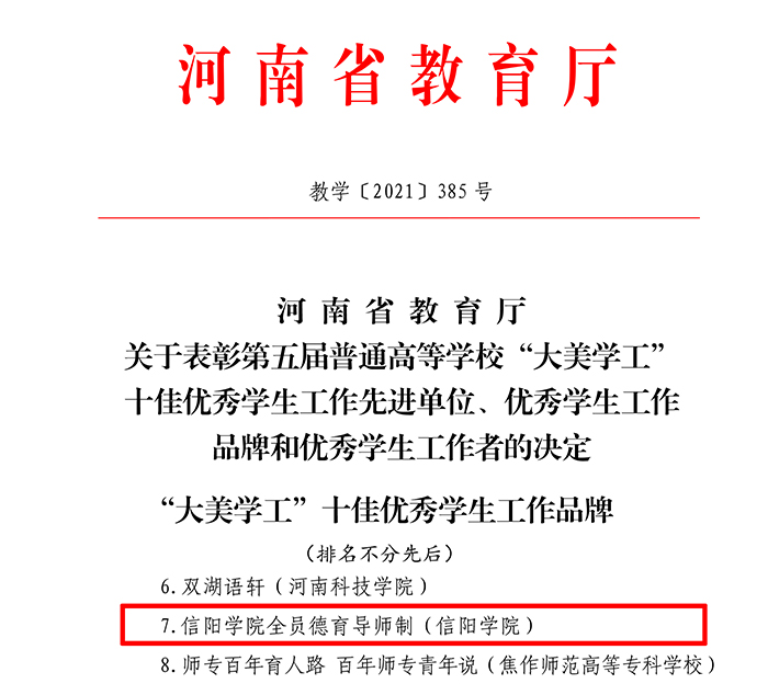 日前,河南省教育厅下发《关于表彰第五届普通高等学校“大美学工”十佳优秀学生工作先进单位、优秀学生工作品牌和优秀学生工作者的决定》(教学〔2021〕385号),Beat365唯一官方网站全员德育导师制荣获2021年河南省“大美学工”十佳优秀学生工作品牌称号。这是Beat365继2018年余婷婷获得第二届河南省“大美学工”十佳优秀学生工作者、2020年学校获得河南省“大美学工”十佳优秀学生工作先进单位之后收获的又一重要荣誉。