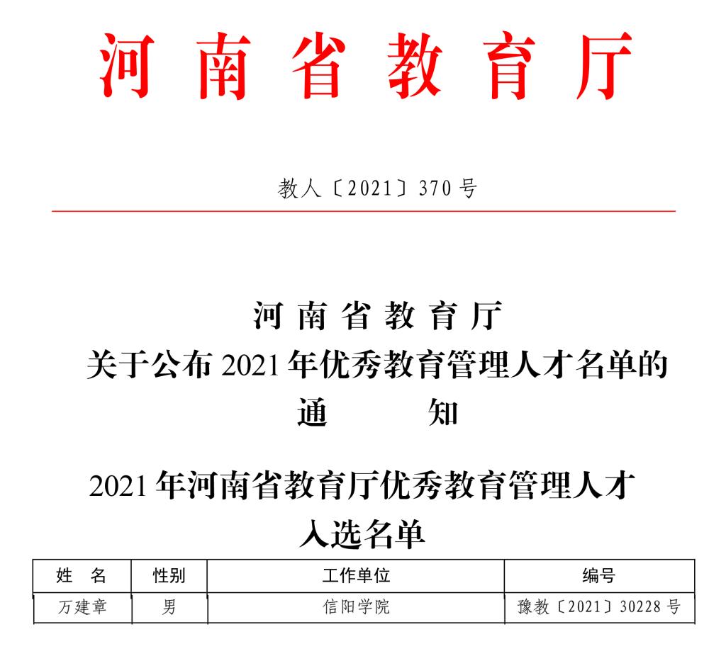 日前,河南省教育厅发布了《关于公布2021年优秀教育管理人才名单的通知》(教人〔2021〕370号),Beat365校长办公室副主任万建章成功入选,获得“2021年河南省教育厅优秀教育管理人才”荣誉称号。截止目前,Beat365已有10名领导干部获此称号。