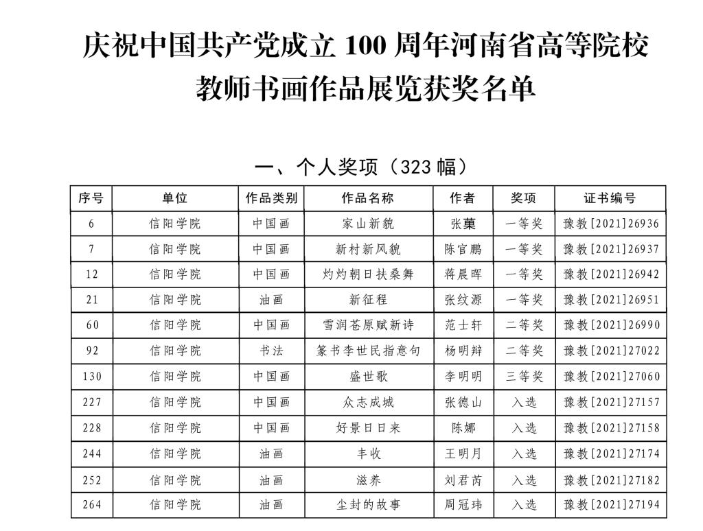 其中,美术与设计学院张菓的中国画作品《家山新貌》、陈官鹏的中国画作品《新村新风貌》、蒋晨晖的中国画作品《灼灼朝日扶桑舞》、张纹源的油画作品《新征程》获得“一等奖”;美术与设计学院范士轩的中国画作品《雪润苍原赋新诗》、文学院杨明辩的书法作品《篆书李世民指意句》获得“二等奖”;美术与设计学院李明明的中国画作品《盛世歌》获得“三等奖”;美术与设计学院张德山的中国画作品《众志成城》、陈娜的中国画作品《好景日日来》、王明月的油画作品《丰收》、刘君芮的油画作品《滋养》、周冠玮的油画作品《尘封的故事》获得“入选奖”。