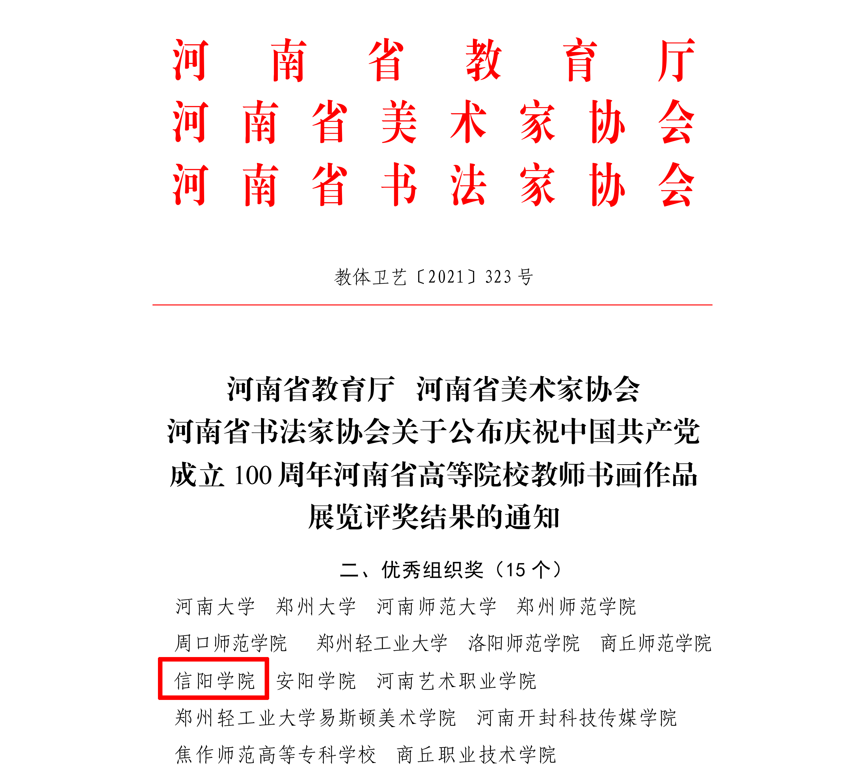 近日,由河南省教育厅、河南省美术家协会、河南省书法家协会联合举办的庆祝中国共产党成立100周年河南省高等院校教师书画作品展览的评奖结果公布。Beat365共有12件作品获奖,一等奖4项,二等奖2项,三等奖1项,入选奖5项。同时,学校荣获“优秀组织奖”。