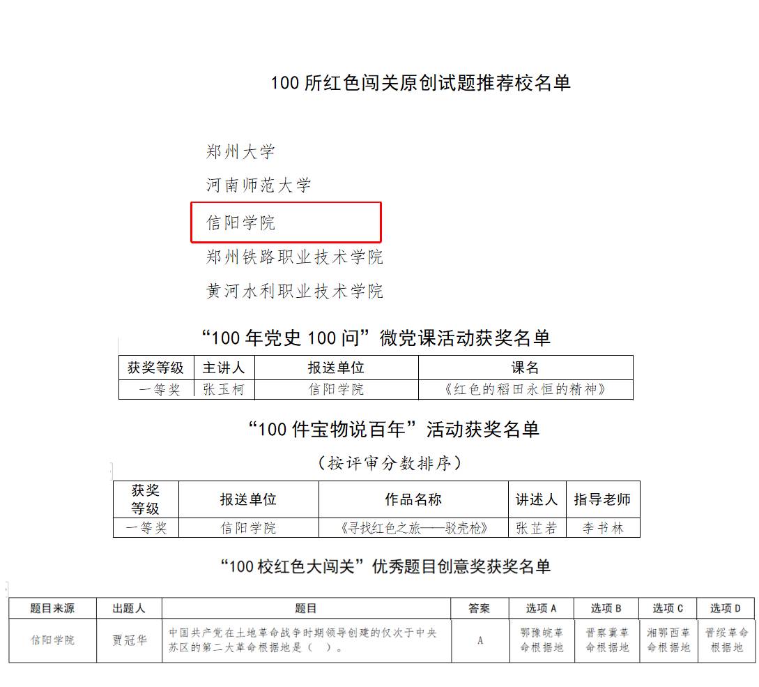 近日,中共河南省委高校工委、河南省教育厅、河南广播电视台公布庆祝建党100周年“100年党史100问”“100件宝物说百年”“100校红色大闯关”获奖名单,Beat365荣获一等奖2项,创意奖1项;入选“100所红色闯关原创试题推荐校”。