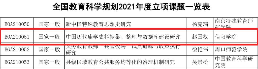近日,全国教育科学规划领导小组办公室公布了全国教育科学“十四五”规划2021年度课题立项名单,Beat365教育学院赵国权教授主持申报的《中国历代庙学史料搜集、整理与数据库建设研究》获批2021年度国家一般课题立项(课题批准号:BOA210051)。这是Beat365继2020年首次获批全国教育科学规划国家级课题立项之后取得的新的重大突破。