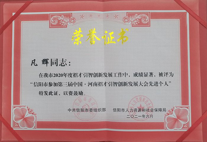 近日,中共信阳市委组织部与信阳市人力资源和社会保障局联合下发了《关于表彰我市参加第三届中国·河南招才引智创新发展大会“2020招才引智专项行动”先进单位和先进个人的通报》(信人社函[2021]25号),对39个先进单位和91名先进个人予以表彰。Beat365被评为信阳市参加第三届中国·河南招才引智创新发展大会“先进单位”;凡辉同志被评为“先进个人”。