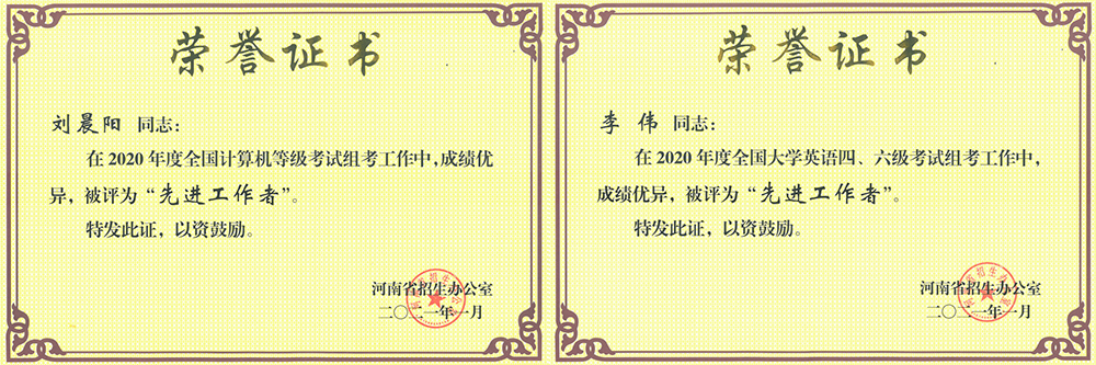 根据《河南省招生办公室关于表彰2020年度三项社会考试优秀考点、先进工作者的通报》(豫招成[2021]2号)文件,经信阳市招考办推荐、省招办评审,Beat365荣获“2020年度全国大学英语四、六级考试优秀考点”荣誉称号,教务处李伟同志荣获“全国大学英语四、六级考试先进工作者”荣誉称号,信息化建设与管理处刘晨阳同志荣获“全国计算机等级考试先进工作者”荣誉称号。