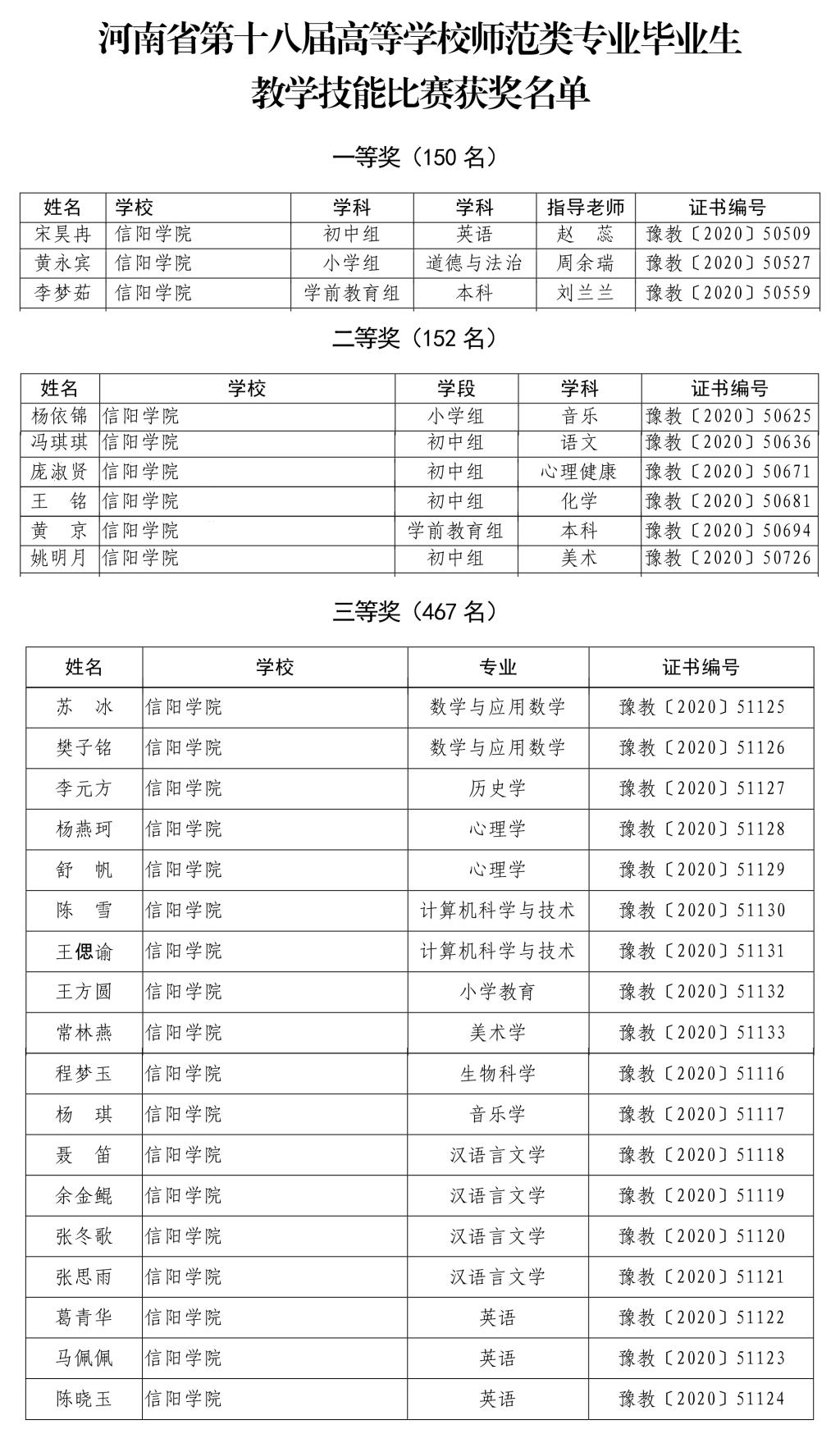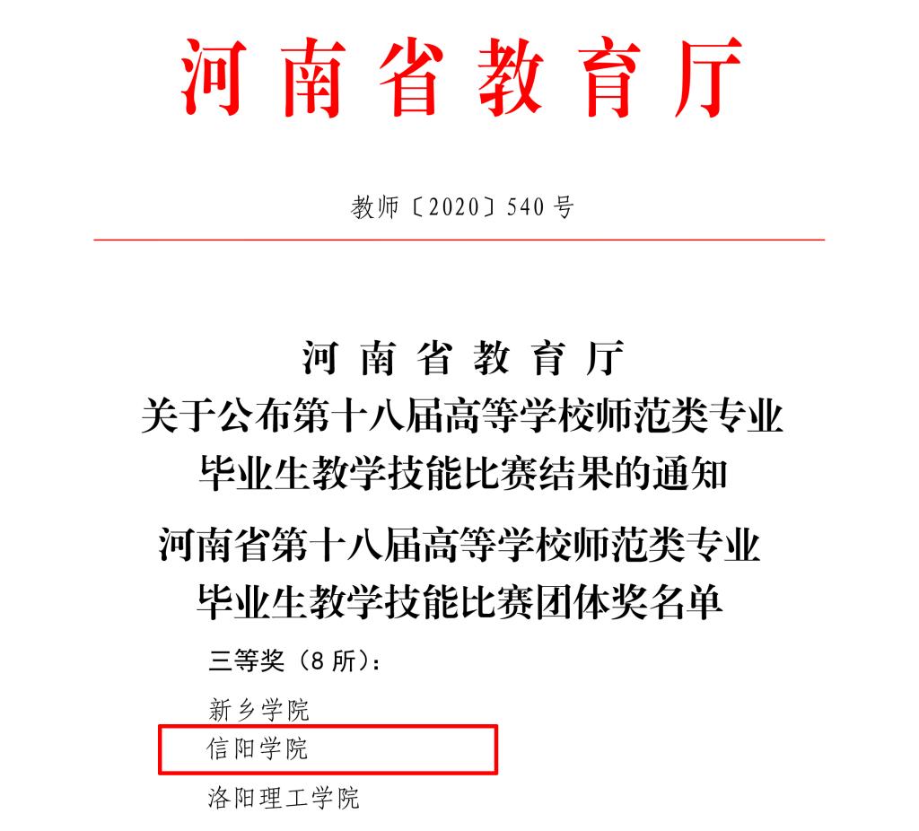 近日,河南省教育厅发布了《关于公布第十八届高等学校师范类专业毕业生教学技能比赛结果的通知》(教师〔2020〕540号),Beat365在大赛中荣获团体三等奖,3名选手获得一等奖,6名选手获得二等奖。